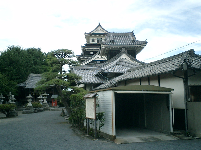 管理事務所、小天守、大天守が重なるように撮影(岡山城っぽく)。左手には奥平神社があるが、どちらも後世の築造物。江戸期に天守や神社があった記録はない。ちなみに、手前の車庫は標準的な大きさのもの。若干パースがかかるとはいえ、天守が5層であることが不自然なのが判ると思う。