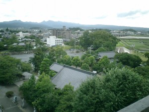 大天守最上階からの眺望。左手が山国川で、手前の建物が中津大神宮。山その向こうの奥にあるのがその社務所で、さらに奥の木立には中津神社がある。また、社務所右側に金比羅神社があるが、ここの櫓が天守代わりだったという。