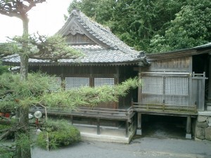 奥平神社の側面から撮影。屋根瓦に雑草が生えている……かなりの財政難かと。