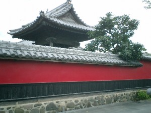 城下の寺町にある合元寺。赤い壁は、騙まし討ちにあった宇都宮家臣のもので、何度塗り替えても赤く浮かび上がることから、赤く塗って目立たなくさせたという。中津城の寺町は道路が狭く、かなりの密集状態にある。自動車は1台ぎりぎり通れる道で、なおかつ曲がりくねっている。往時の面影は忠実に伝えられている。