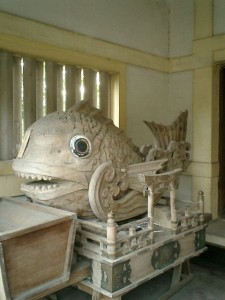 城井神社の表札が、何だかマジックっぽいインクで書かれていた驚いた。下の画像は金比羅社内に安置されていた魚のお神輿。これも初めて見た代物でびっくり。
